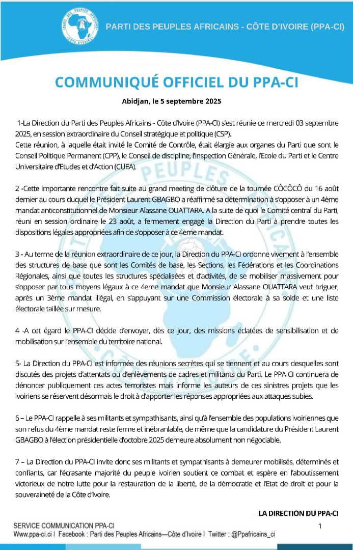 Le PPA-CI envoie dès ce Vendredi 05 Septembre 2025, des missions de mobilisation sur toute l’étendue du territoire national. Ivoirnews24.net vous propose l’intégralité de ce communiqué du PPA-CI.
