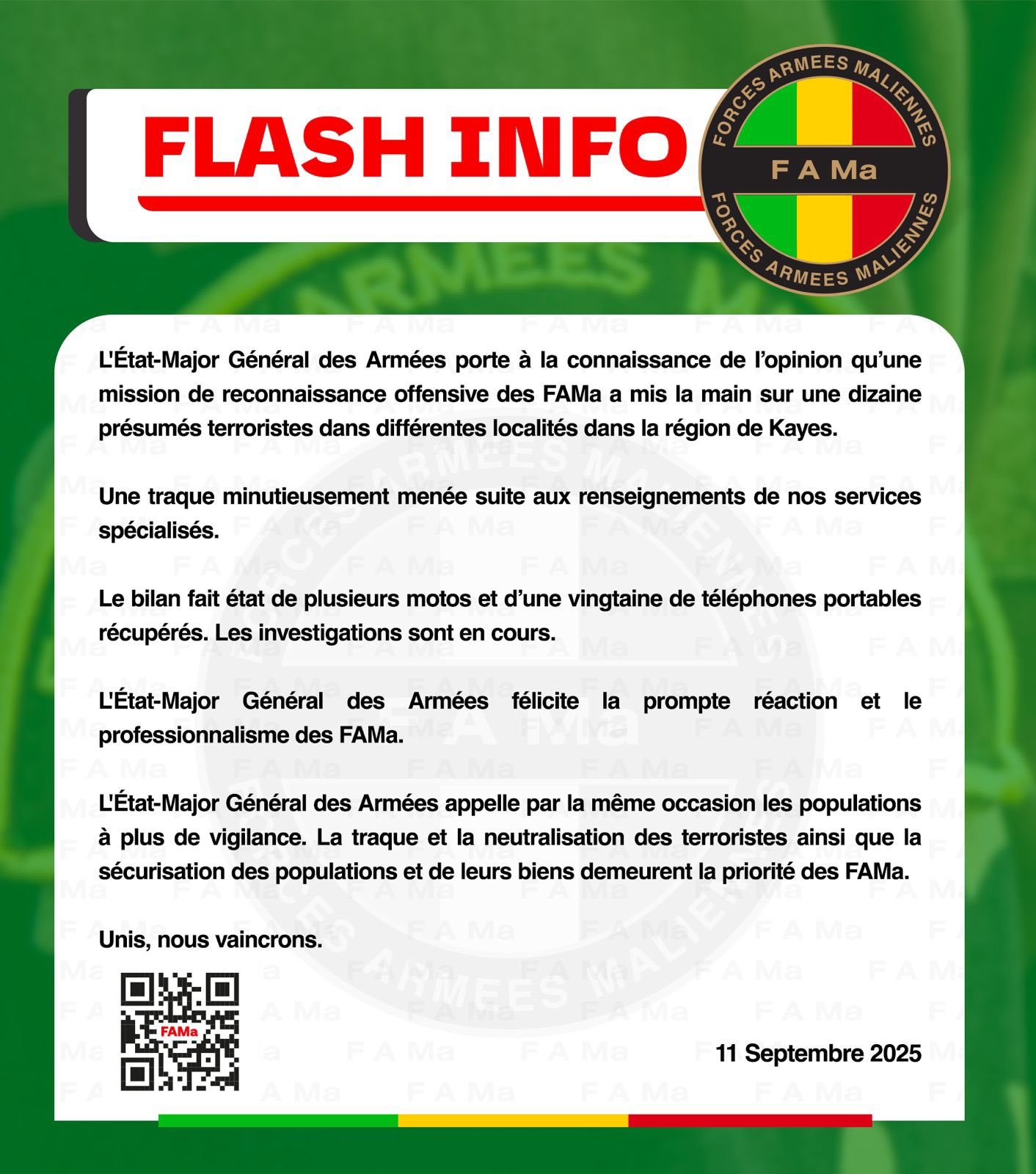 Mali : L’état Major de l’armée annonce avoir mis aux arrêts, une douzaine de combattants et collaborateurs présumés du JNIM, « Plusieurs motos et 20 téléphones portables confisqués »